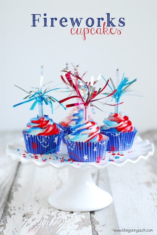 These two-ingredient cupcakes are topped with a swirled red, white, and blue frosting and a fun fireworks cupcake topper!