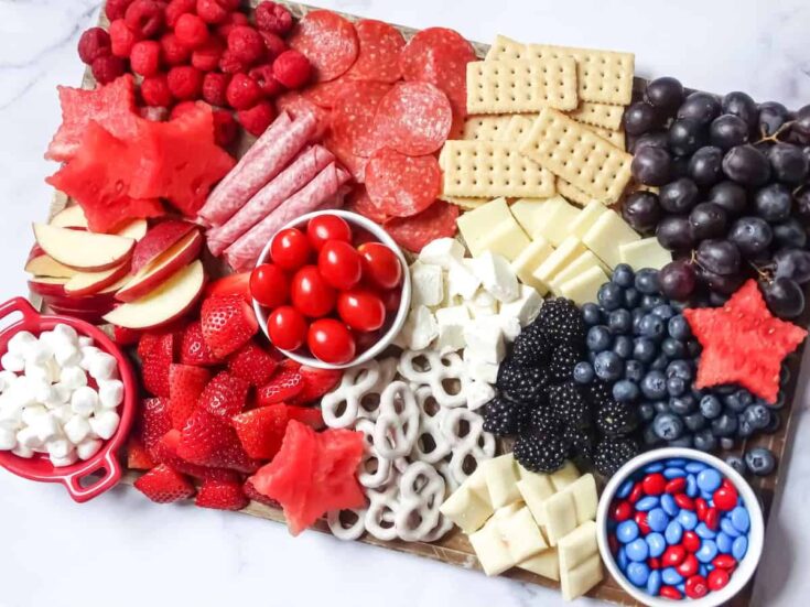 A perfect blend of meats, crackers, cheese, fruit, and sweet items, this patriotic charcuterie board is the perfect thing for kids to help prepare!