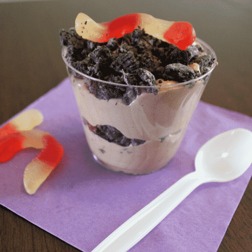 These adorable pudding cups topping with crushed cookies and gummy worms deserve a spot at your bug snack table!