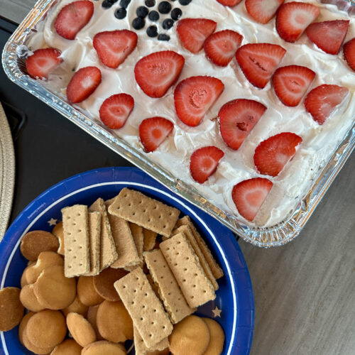 Optional: Place sliced strawberries and blueberries in an American flag design, as pictured.